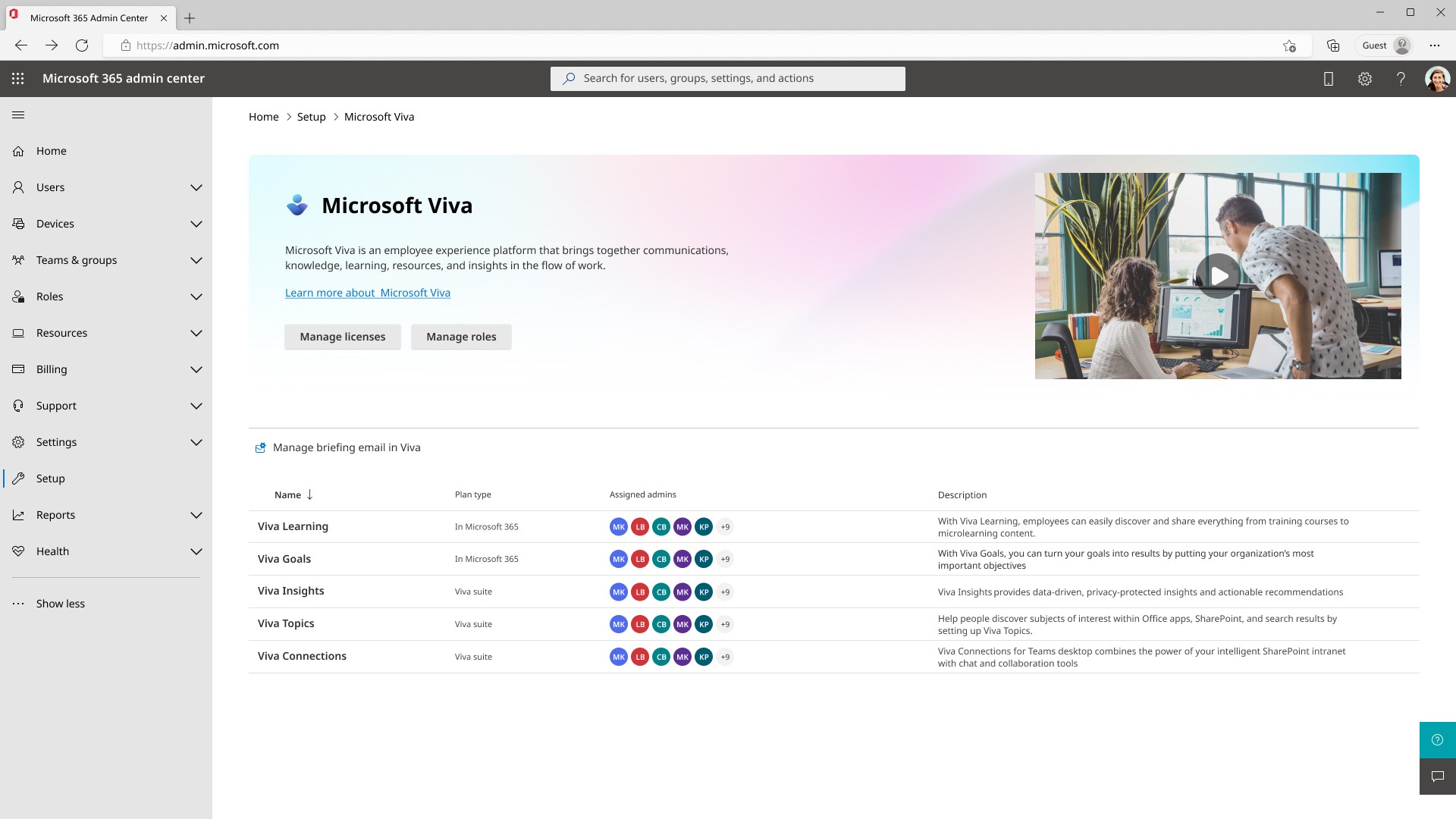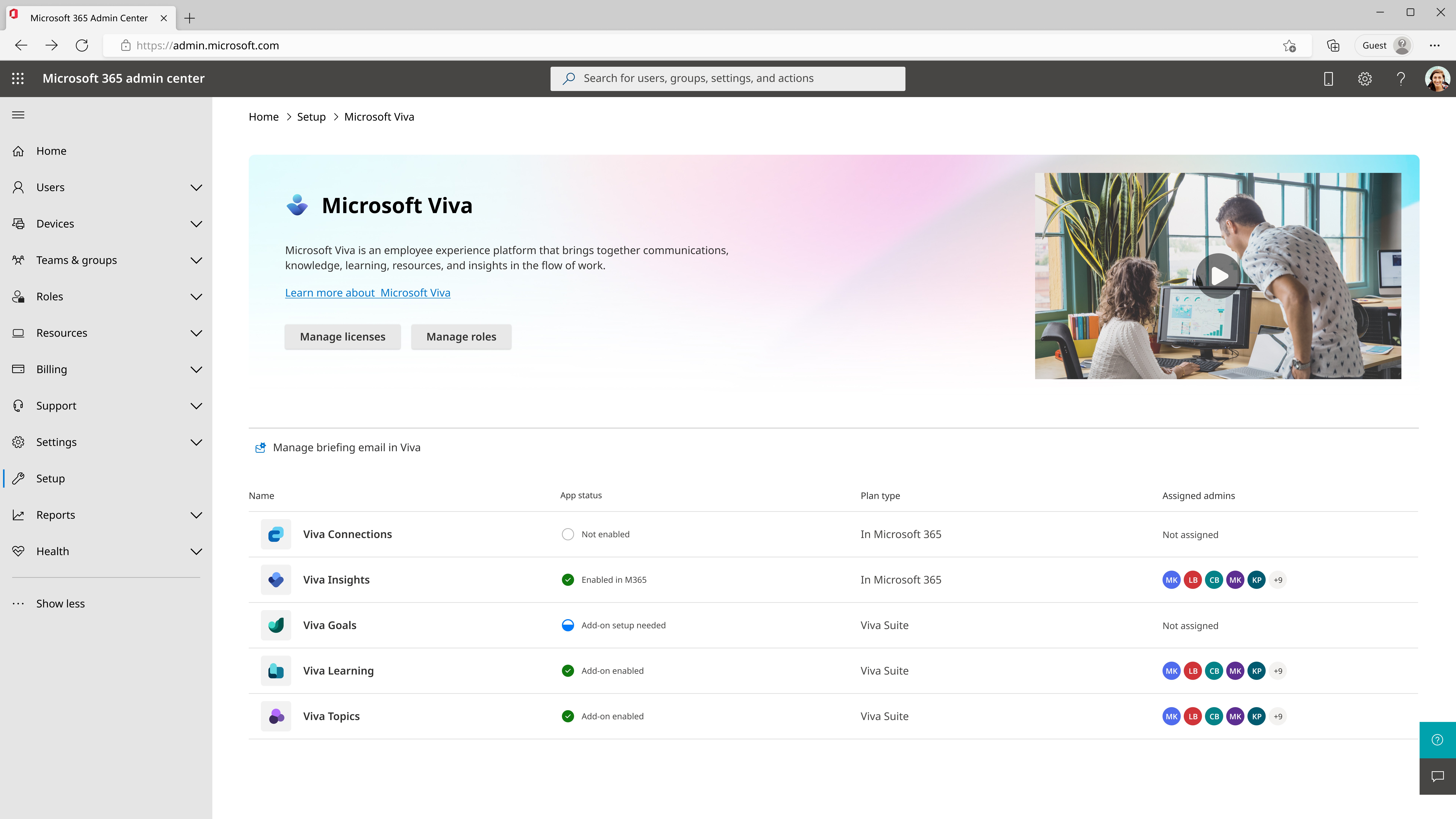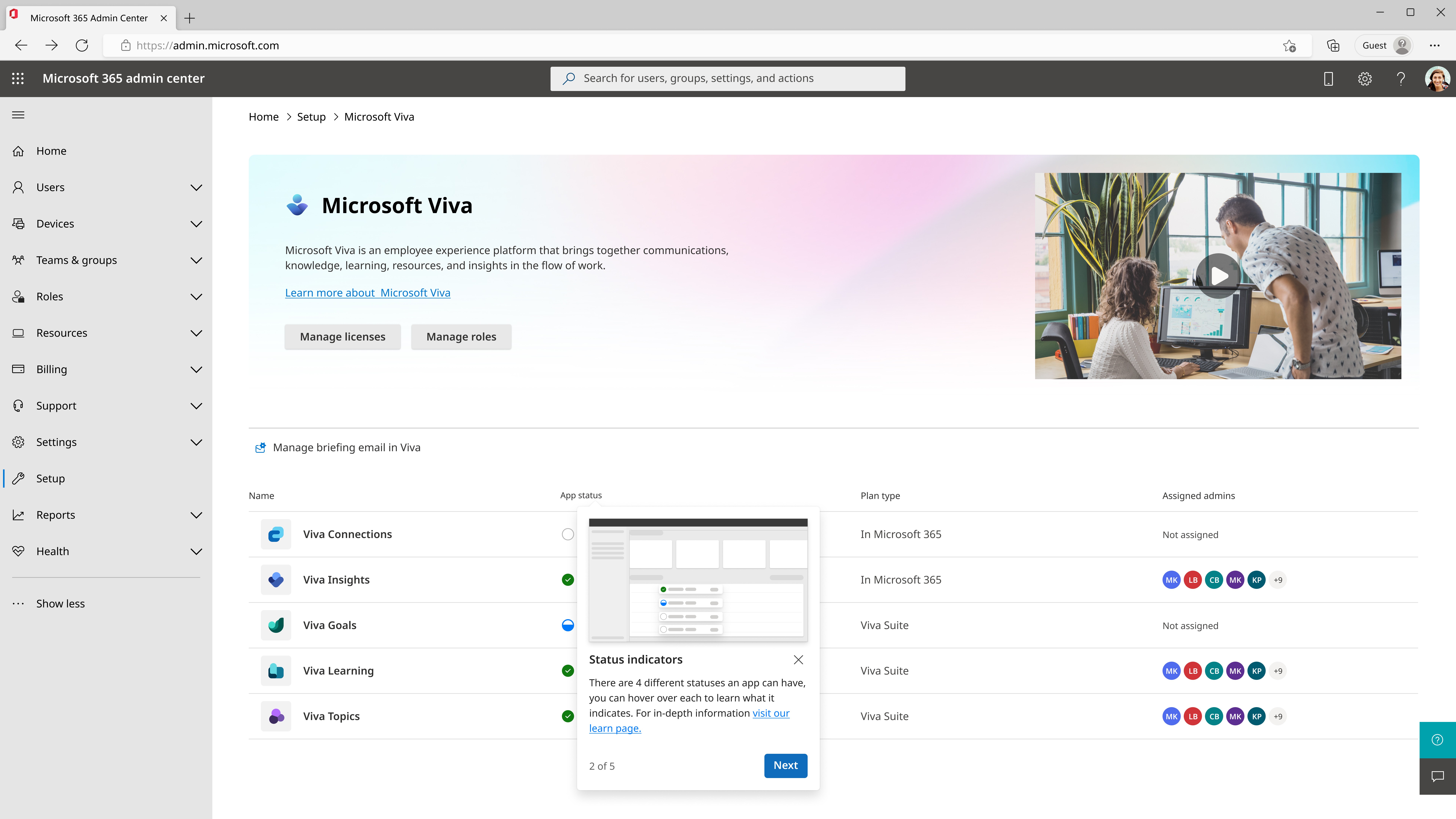 The Viva app management dashboard in the Microsoft admin center allows admin users to setup, deploy, and manage the Viva apps purchased by an admin’s company