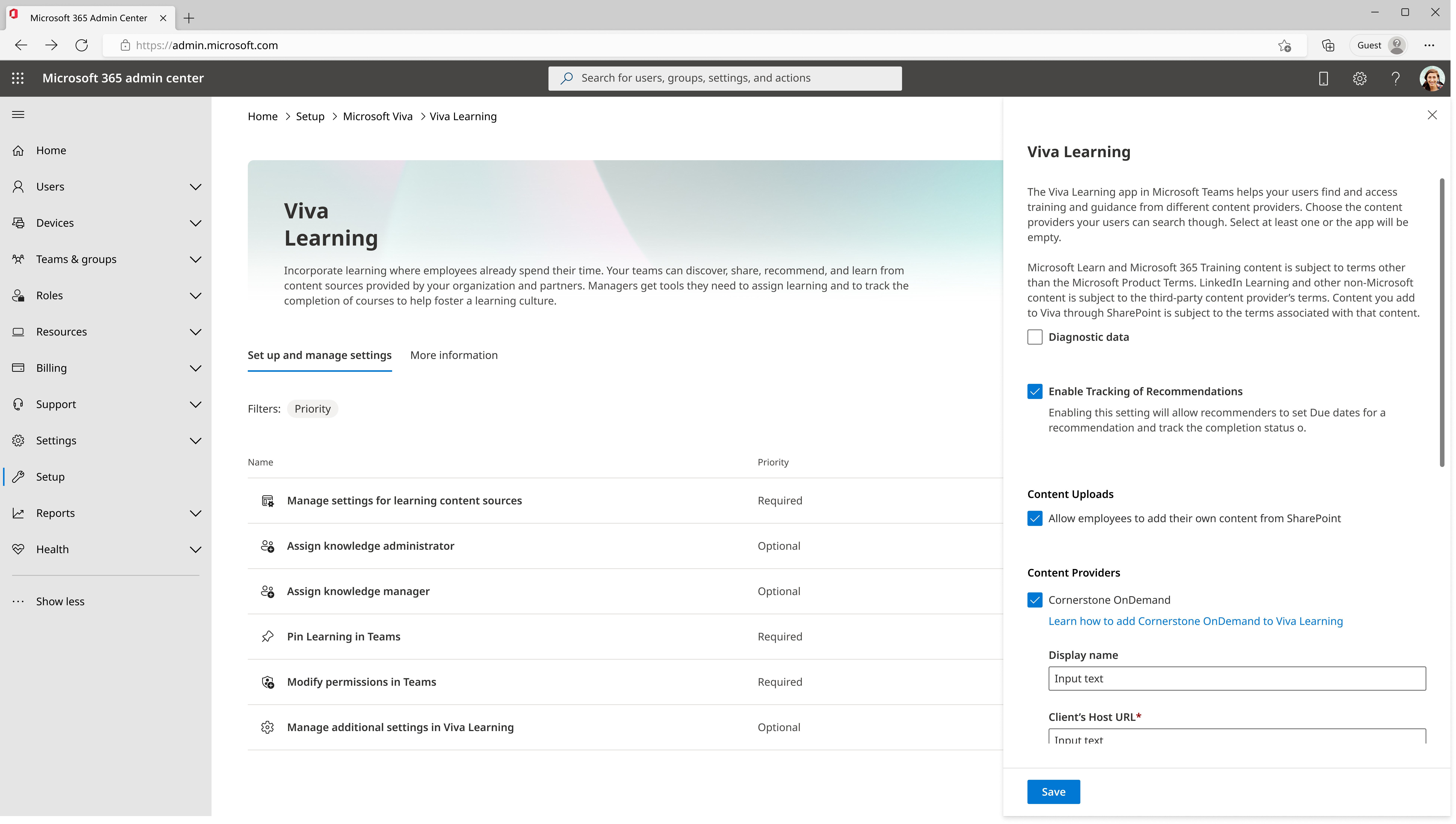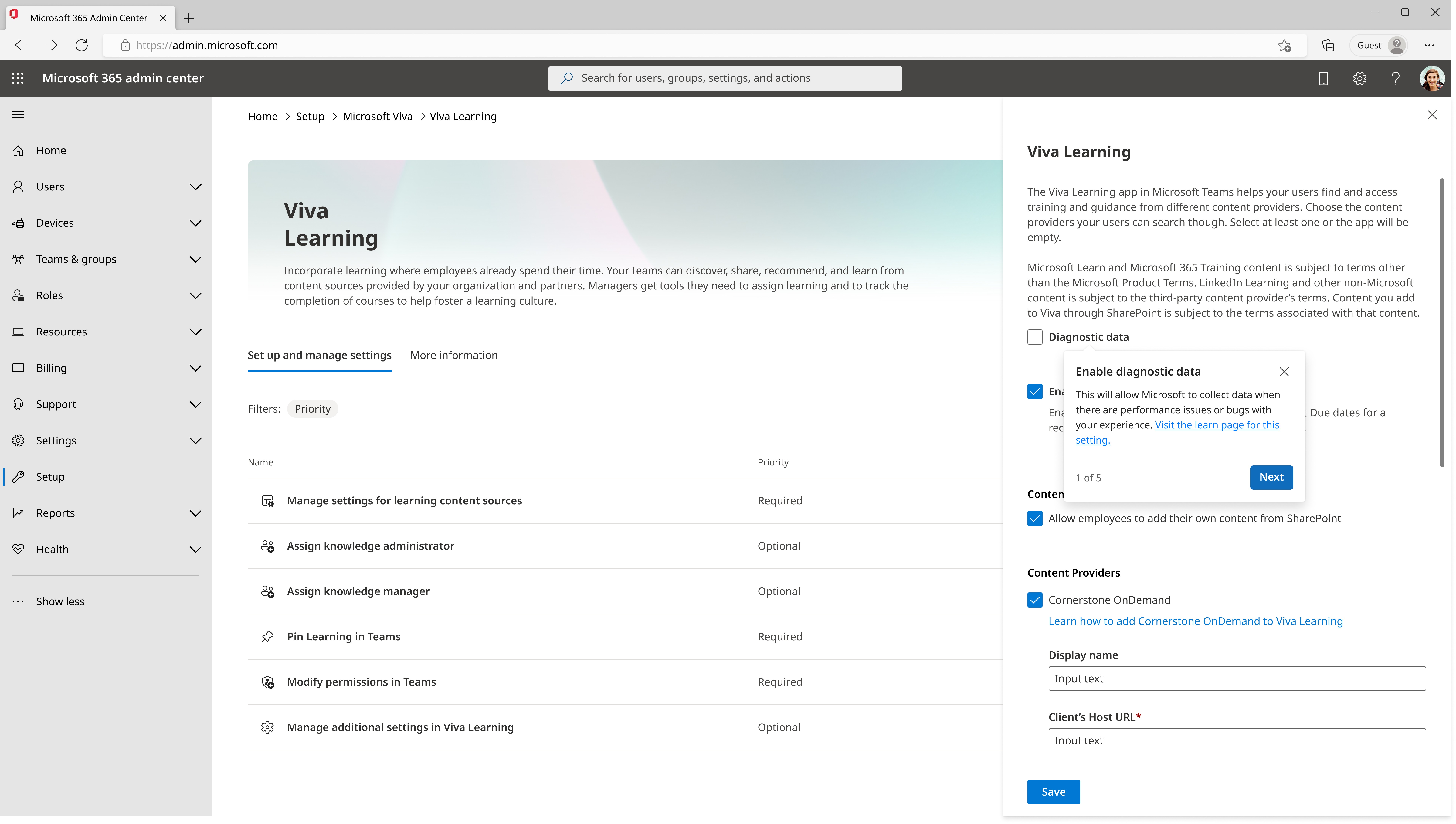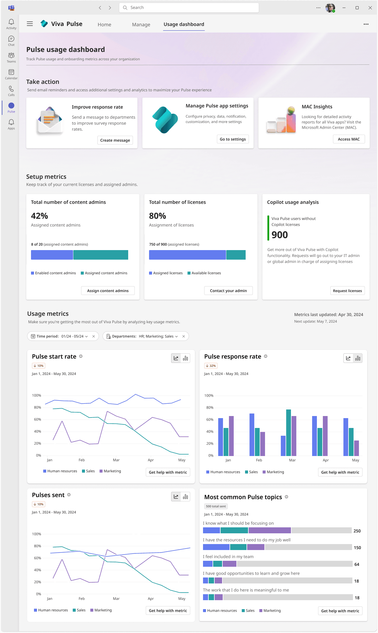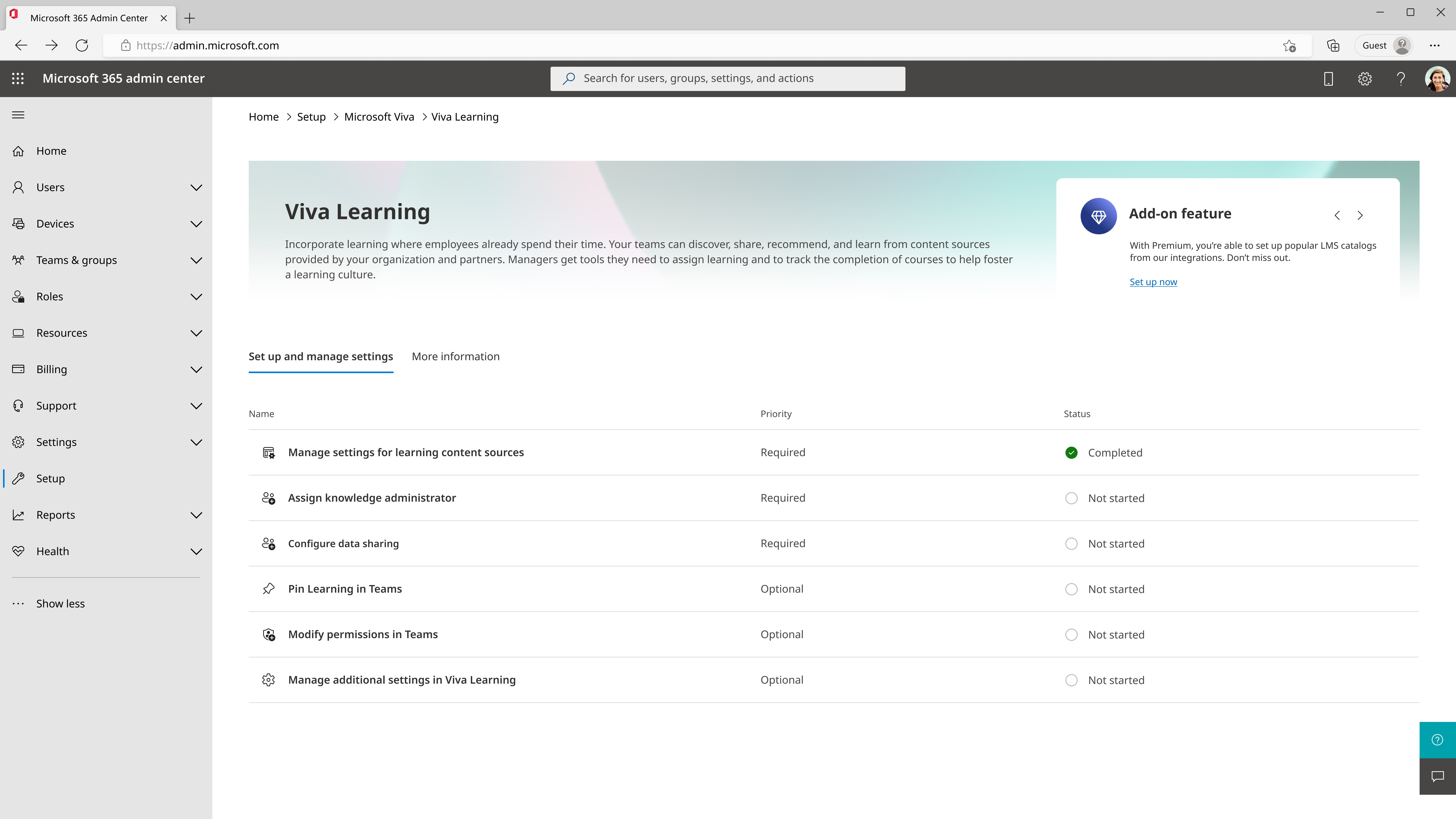 The Viva app management dashboard in the Microsoft admin center allows admin users to setup, deploy, and manage the Viva apps purchased by an admin’s company