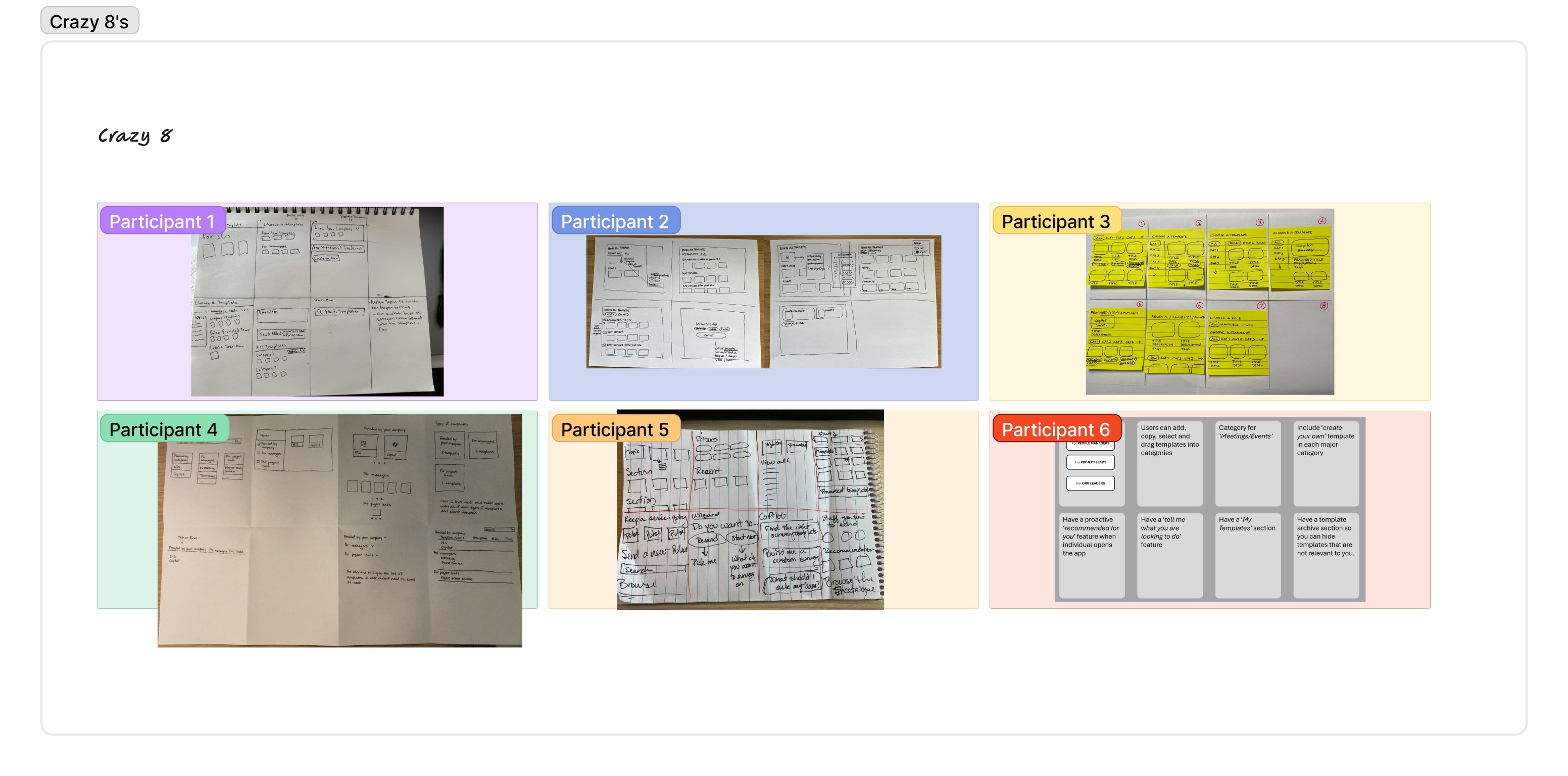 We then sorted the crazy 8's ideas into three categories of potential approaches: