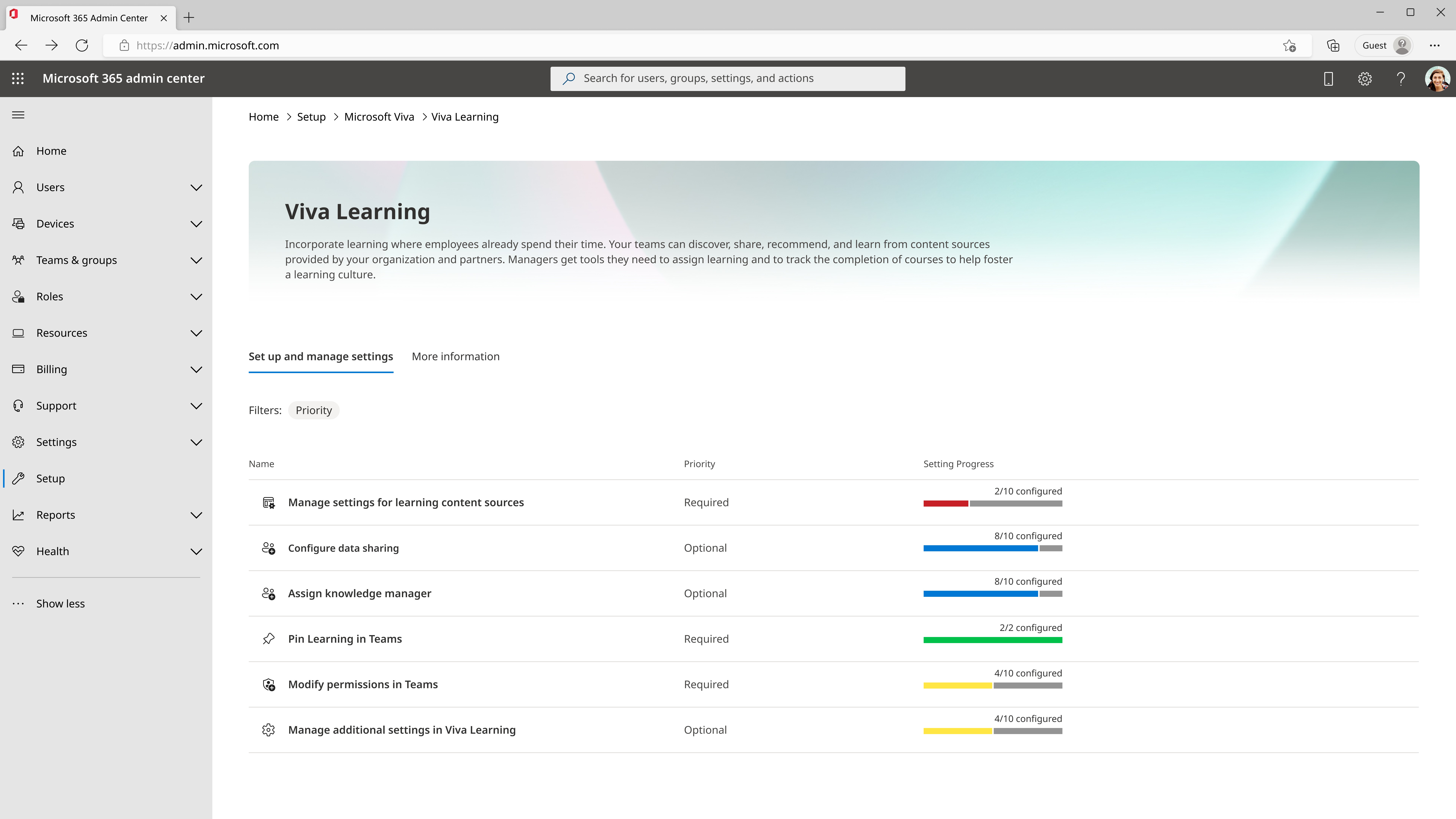 The dashboard guides admins through key configuration tasks, including permissions, role and audience assignment, and content sources, to ensure all app features are fully operational.