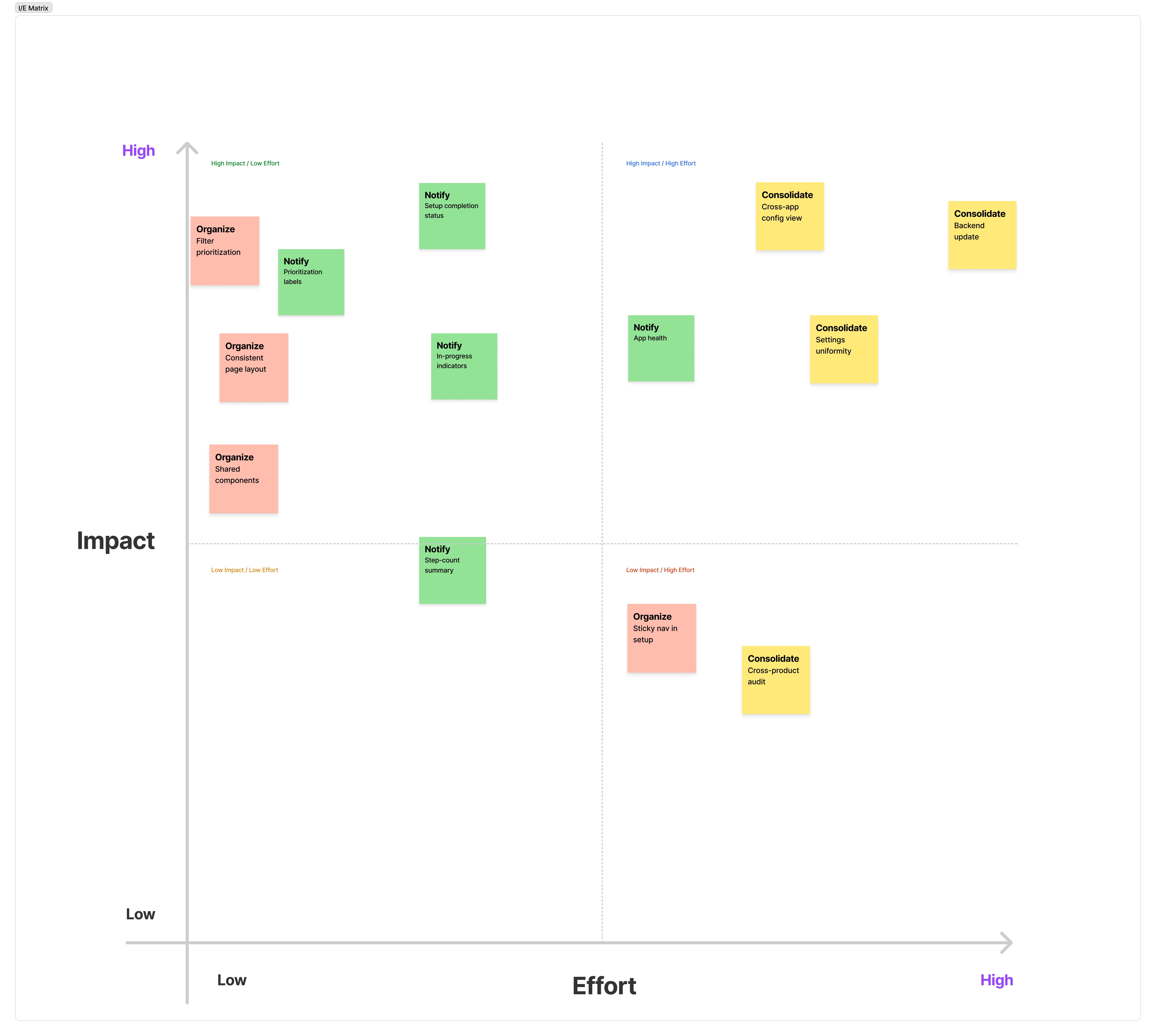 After summarizing categorizing the ideas outside of the workshop, I brought the team back together for some impact mapping. The categories I identified were: