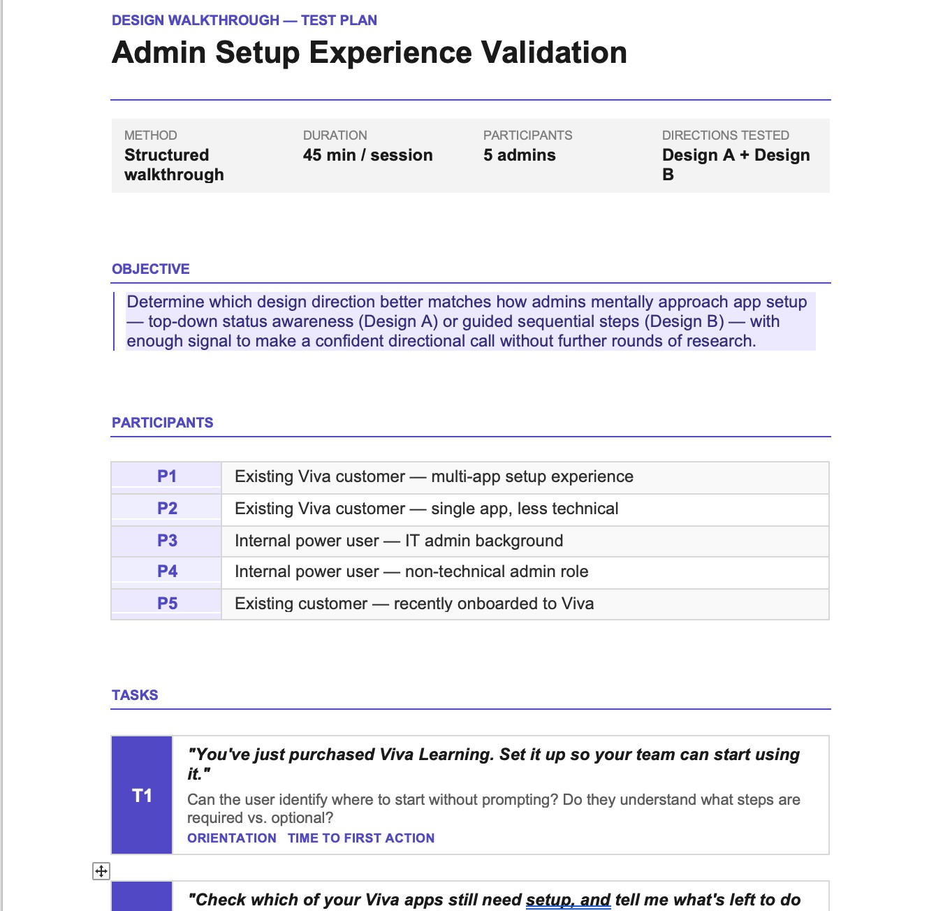Before committing to a direction, I setup a testing plan and ran structured walkthroughs with 5 admins.